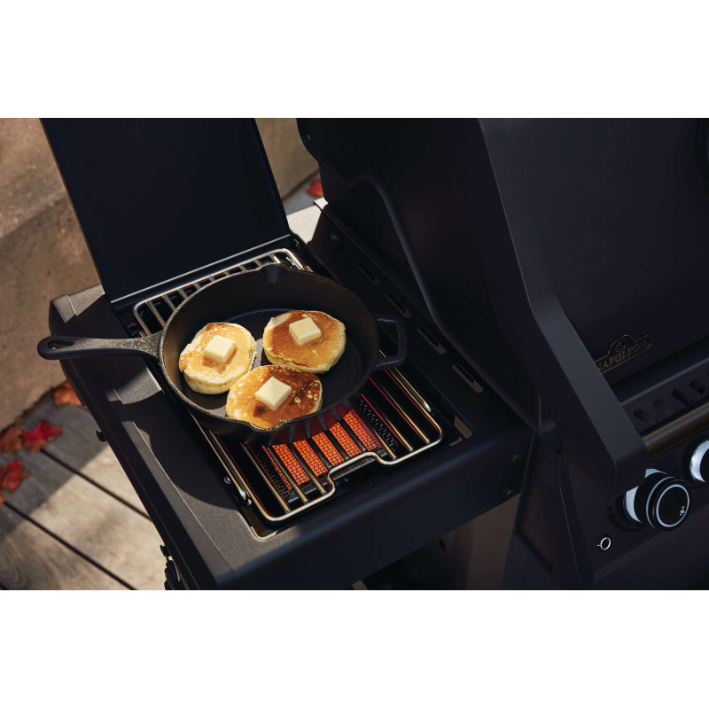 Phantom PRO-S 425 - компактный и функциональный гриль от Napoleon. Он оснащен тремя основными горелками, задней горелкой для вертела и высокотемпературной инфракрасной горелкой SIZZLE ZONE на боковом пристолье. Глубокий матовый черный цвет, стильная подсветка ручек управления и массивные барбекю-решетки из нержавеющей стали делают его не только функциональным, но и эстетически привлекательным. Благодаря пять пирамидообразных испарителям возгорание капающего жира предотвращается, а еда приобретает дополнительные ароматы. Наличие многофункциональной полки позволяет использовать ее для различных целей - от подогрева до хранения уже приготовленных блюд в тепле.